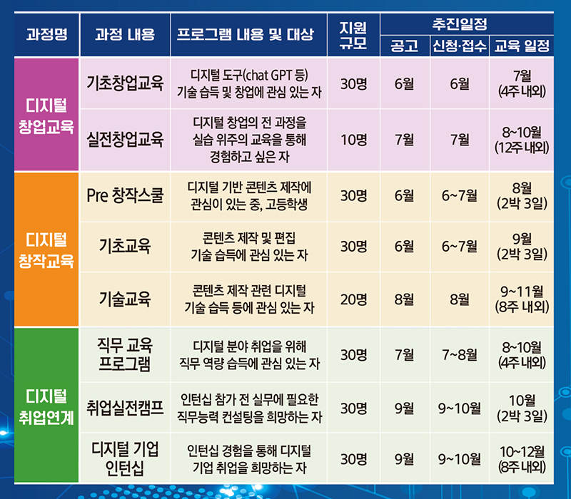 이에 디지털 활용 교육 및 취업실전캠프 등을 통해 디지털 기반 직무역량 강화를 지원하고, 디지털 기업 매칭을 통해 실무를 체험할 수 있는 인턴십 참여 기회를 제공할 예정이다.