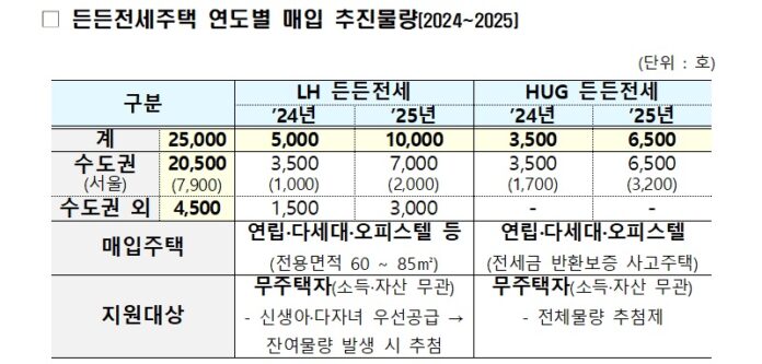 LH 든든전세주택은 3∼4인 가구가 쾌적하게 생활할 수 있도록 전용면적 60~85㎡의 신축 주택을 1만 5000가구를 매입하고, HUG 든든전세주택은 집주인 대신 전세금을 돌려주고 경매 신청한 주택을 HUG가 직접 낙찰받아 1만가구를 매입한다.