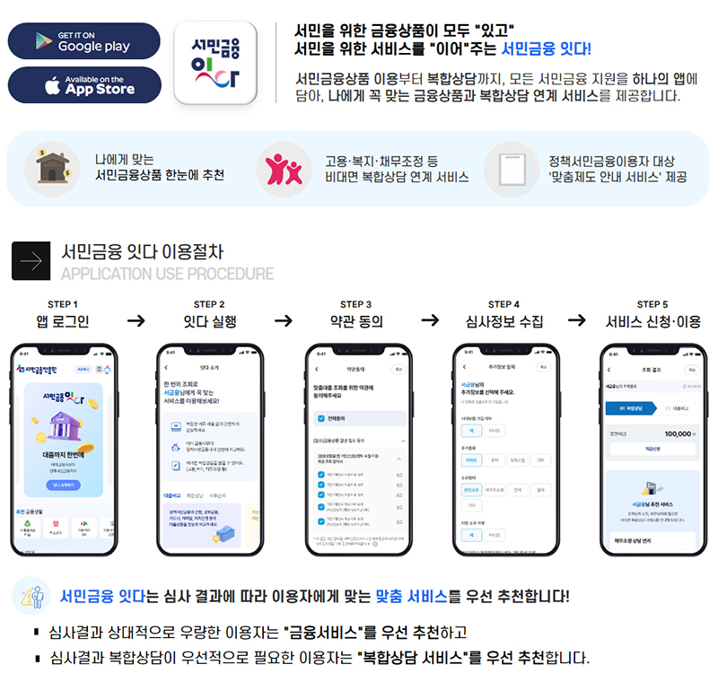 이용방법은 구글 플레이 또는 앱 스토어에서 ‘서민금융 잇다’를 내려받고 로그인 후 약관 동의와 심사정보 수집, 서비스 신청·이용 등을 수락하면 된다.