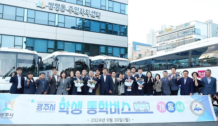 시는 30일 쌍령동 주민자치센터 주차장에서 통학버스 관계자들과 내빈 및 지역주민들이 참석한 가운데 개통식을 열고 광주형 학생 통학버스 운행을 시작했다.
