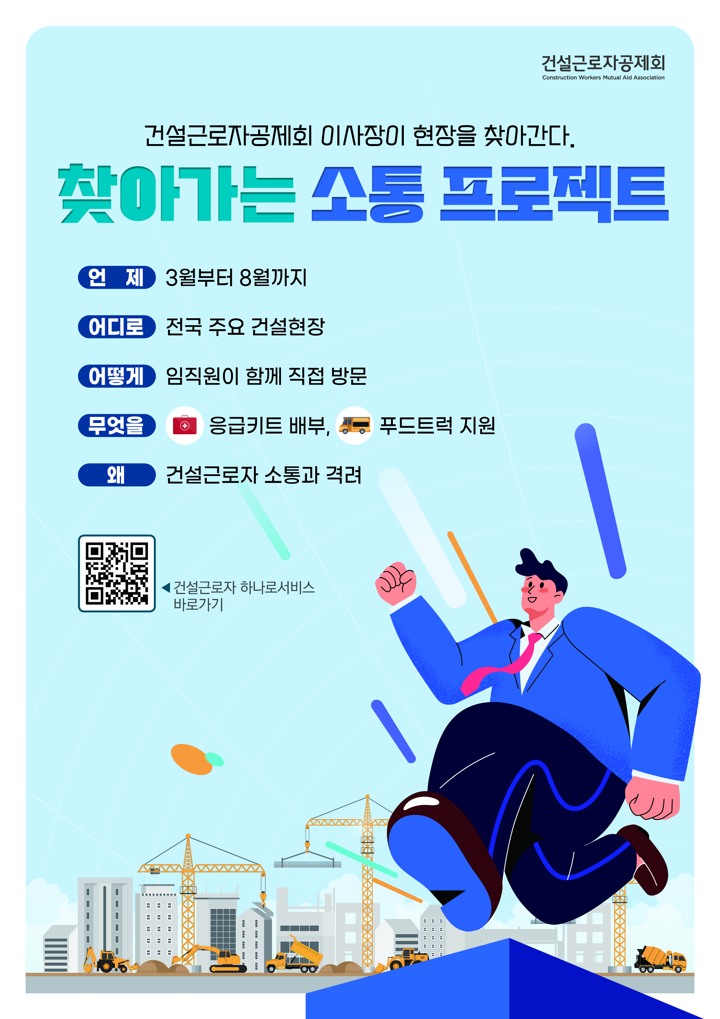 행사내용은 이사장과 권역별 지사장이 함께 점심시간(11~13시)에 건설현장을 찾아가 근로자와 소통하고 격려하는 시간을 갖는다. 건설현장에서 빈번하게 발생하는 상처 등을 처치할 수 있는 ‘휴대용 응급키트’를 배부하여 근로자의 안전과 건강을 지원하며, 푸드 트럭을 통한 음료 및 간식거리도 제공할 예정이다.